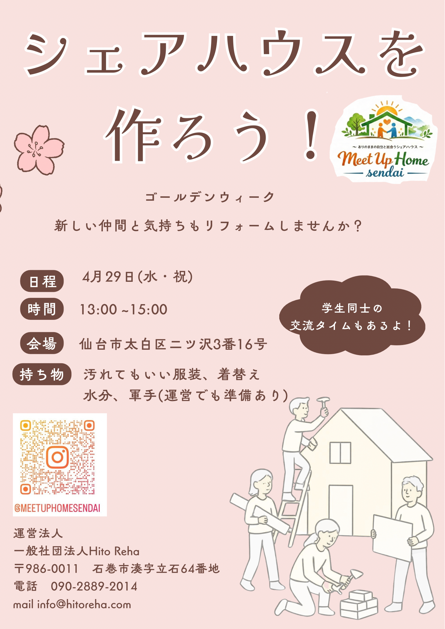 Meet Up Home仙台初となるイベント開催が決定しました 今回行うのは〈古い家具の解体作業〉!バリバリ解体して、スッキリして、ついでに新しい友だちも見つけちゃいましょう これから始まるシェアハウスづくりを、みんなで […]