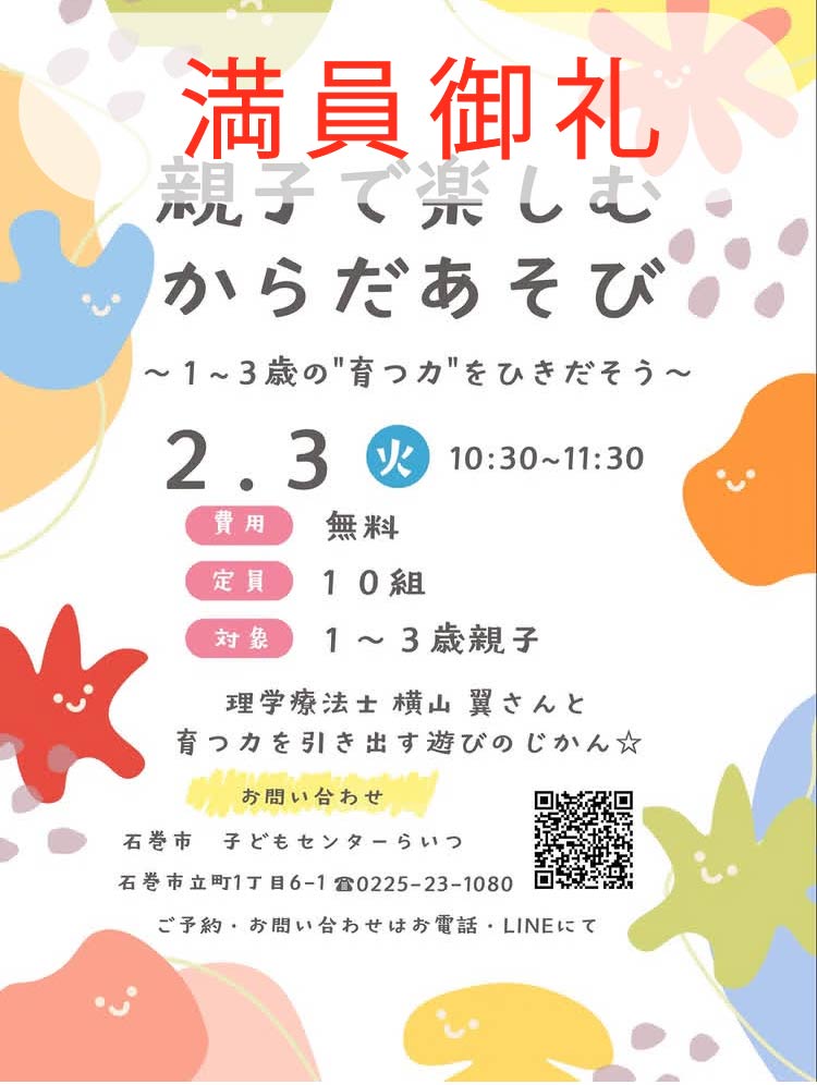 2026.01.25 お知らせ、石巻圏域の地域活動 hitoreha 1歳から3歳児向け発達促進 石巻市子どもセンター「らいつ」 2月3日(火)10時30分~11時30分 1歳児から3歳児向けの発達促進プログラムを親子で一緒に遊べるように提供させていただきます。 ※すでに満員御礼でキャンセル待ちでした。 Tweet Share Hatena